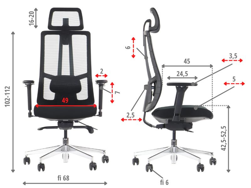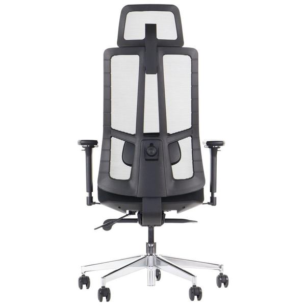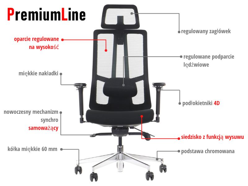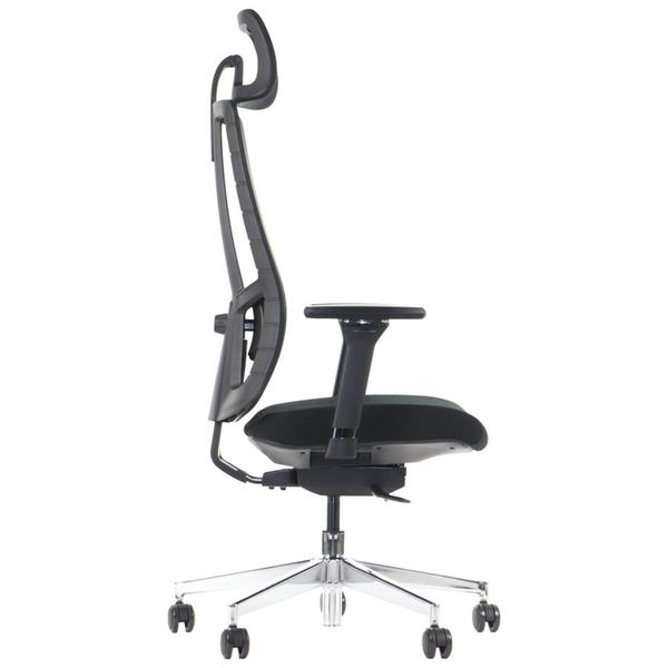Regulowane podłokietniki 4D oraz możliwość dopasowania podparcia lędźwiowego w pionie i w poziomie. Oparcie z regulacją wysokości sprawia, że model ten szczególnie dobrze sprawdzi się u osób wysokiego wzrostu. Dodatkowa funkcja regulacji głębokości siedziska umożliwia jeszcze lepsze dopasowanie pozycji, zapewniając maksymalny komfort podczas pracy.